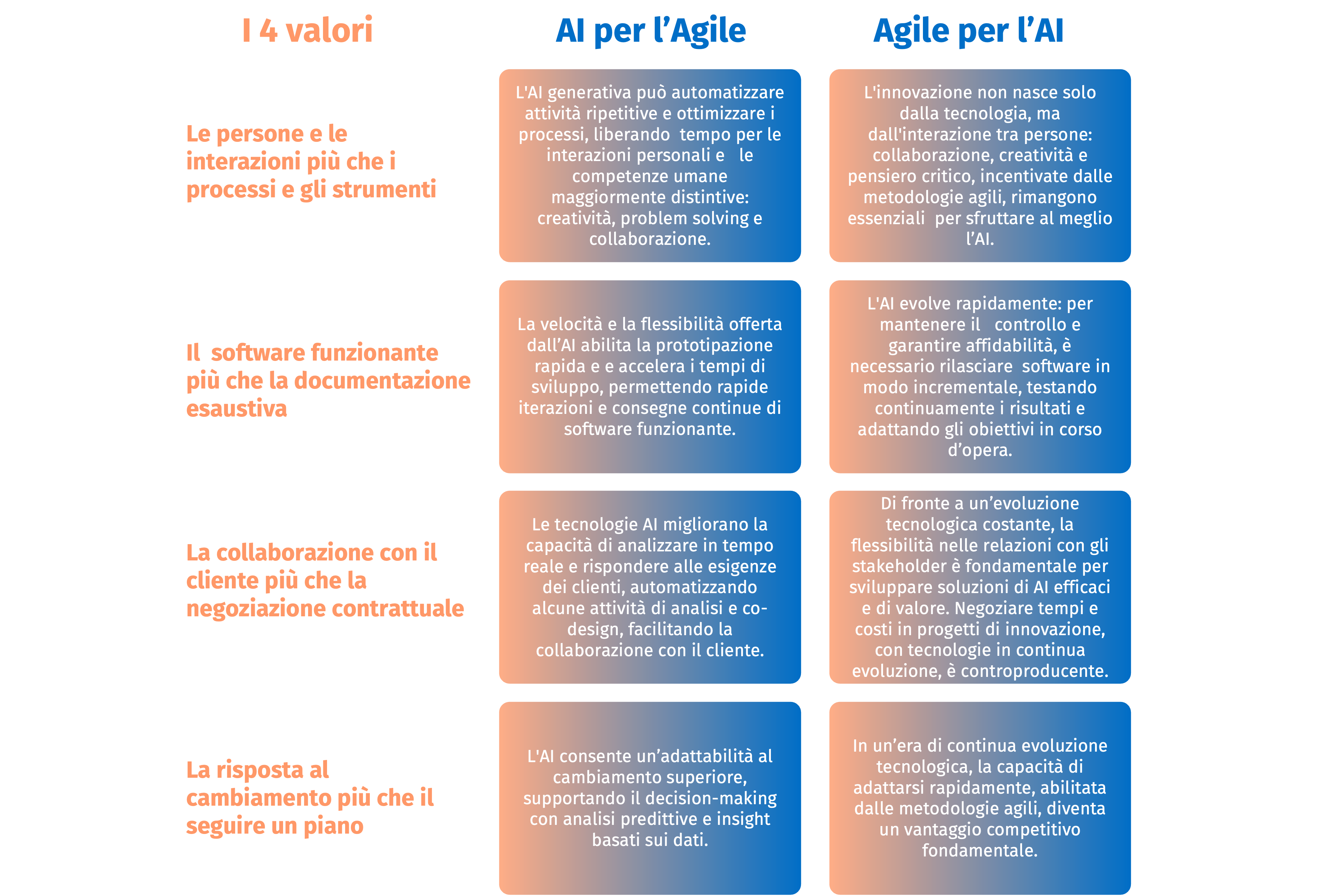 L’integrazione della GenAI nelle Agile Software Factory non ha lo scopo di sostituire il contributo umano, ma di potenziarlo. Automatizzando attività ripetitive e a basso valore aggiunto – come la scrittura di codice, i test automatici e il monitoraggio delle pipeline CI/CD – la GenAI libera tempo prezioso per concentrarsi su ciò che davvero conta: creare valore, migliorare la collaborazione e affinare le strategie di prodotto.