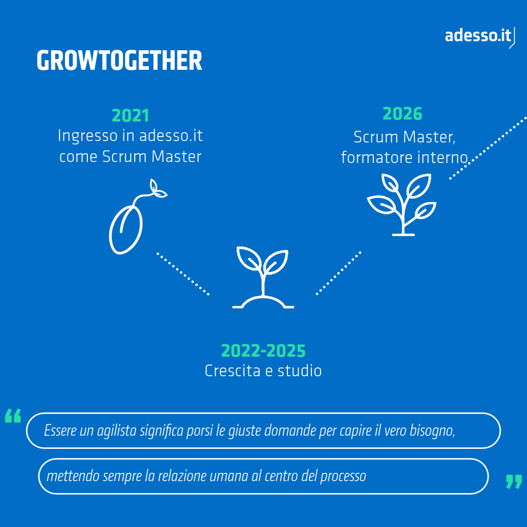 Spesso dico che il termine "Scrum Master" può essere limitante. In adesso.it siamo prima di tutto degli agilisti. L'agilità non è un insieme di regole o strumenti, è un approccio. È il modo in cui affronti e gestisci una sfida, proprio come decidi di gestire le tue finanze personali o i tuoi impegni quotidiani.