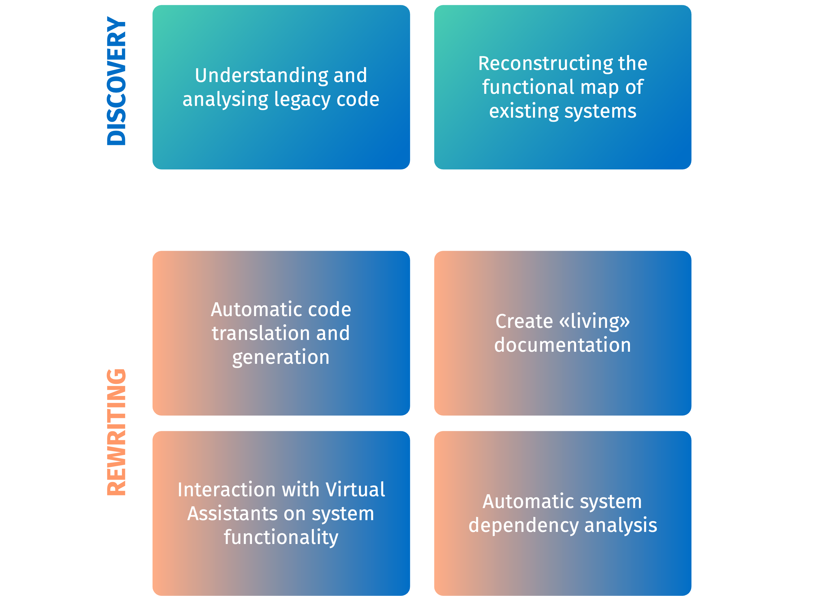 In the Rewriting phase, AI assists in translating and automatically generating code, as well as in creating “living” documentation, supported by virtual assistants that answer developers’ and stakeholders’ questions in natural language about how the system works.