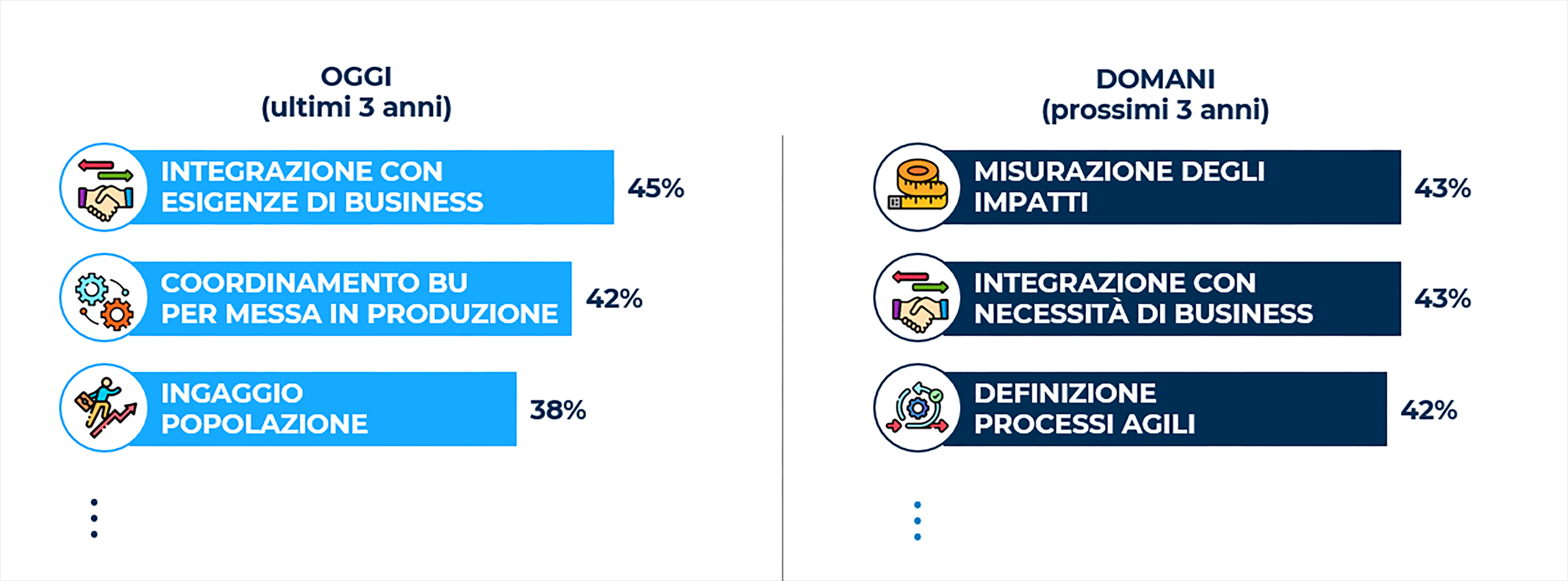 Secondo i dati della Digital Transformation Academy 2024 (Politecnico di Milano), nei prossimi tre anni il focus si sposterà verso una collaborazione strategica con il business, con crescente attenzione alla misurazione degli impatti e all’agilità decisionale e operativa.